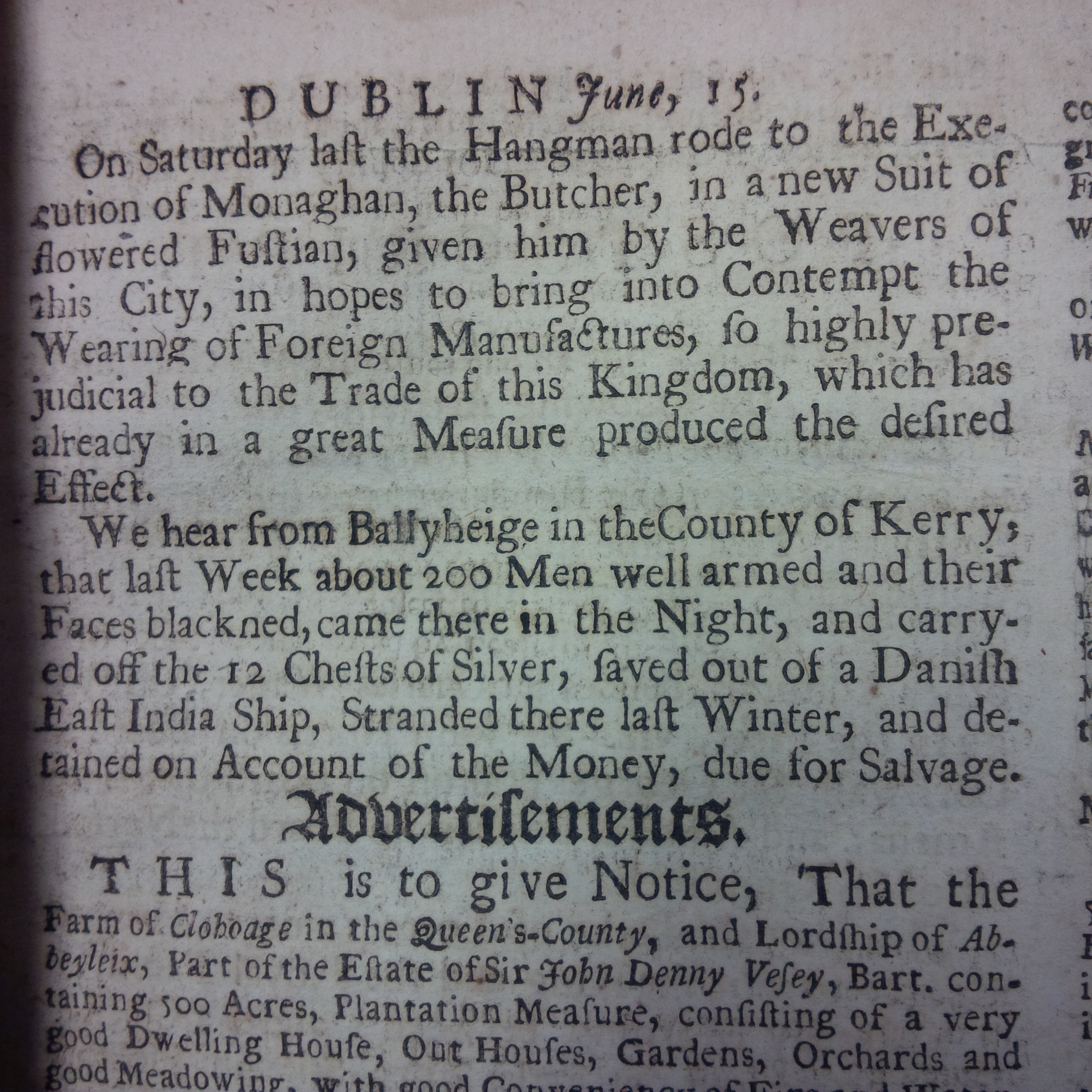 While the matter was being adjudicated around a hundred enterprising locals decided to intervene. Now Ballyheigue also happens to have been the birthplace of the great Irish economist Richard Cantillon – who invented the word ‘entrepreneur’. He might well have described this group in such terms. Most of the North Kerry entrepreneurial class, albeit with blackened faces, surrounded the Crosbie household, broke into the tower, killed two of the Danish guards and made off with the loot on carts. Cantillon wrote in the early 18th century about the movement of gold and silver through the economy. However this was probably not the sort of movement he had in mind.