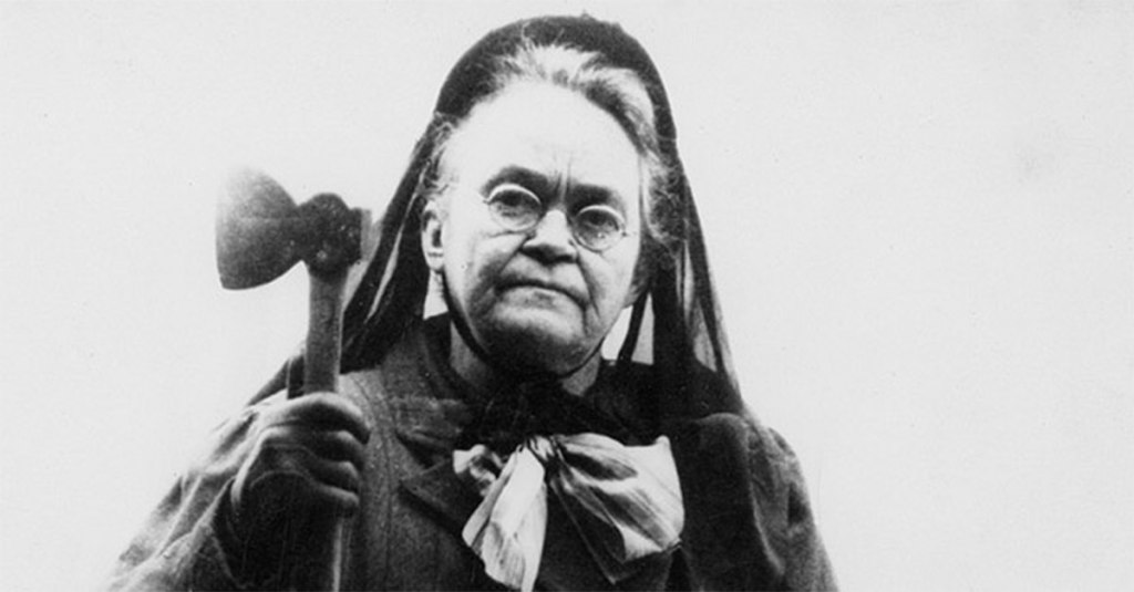 After the American Civil War the Temperance movement made a major comeback in the 1880s. One of its most colourful champions was a woman named Carrie Nation (that’s actually her real name). She was a 19th century prohibitionist whose unique selling point was to arrive in a bar with a hatchet and destroy as much of it as she could before she was arrested. This occurred on at least 30 occasions. Ms. Nation obviously had a dark sense of humour as well, because one of the magazines she published was known as The Smasher’s Mail and another was entitled The Hatchet.