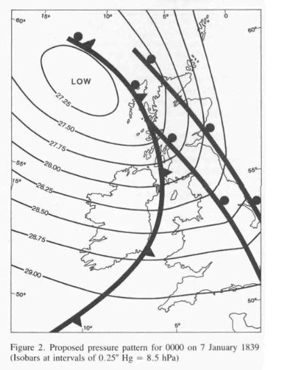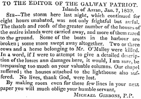 Gradually, during the day, the winds rose. The first area affected was County Mayo where a strong breeze and heavy rains swept in from the Atlantic at around midday. Nollaig na mBan, the religious feast of the Epiphany, wasn’t going to be that pleasant a day after all. There was no Met Éireann in 1839.(We’d be lost without you Met Éireann).