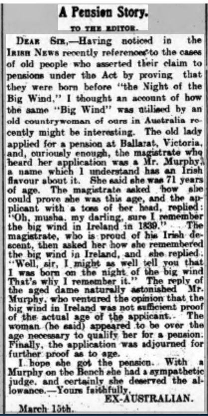 One of the unexpected consequences of the Night of the Big Wind came almost seventy years later, after the British government introduced an old age pension for the over-seventies. As the formal registration of births in Ireland had only begun in 1863, many septuagenarians, legitimately entitled to a pension, had no birth certificates to prove their age. One of the ways of ascertaining their entitlement devised by civil servants was to ask the question ‘Do you remember the Night of the Big Wind’. If they did, they got their pension.